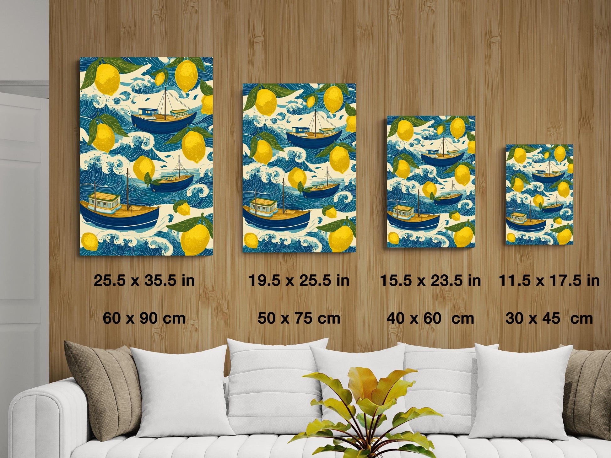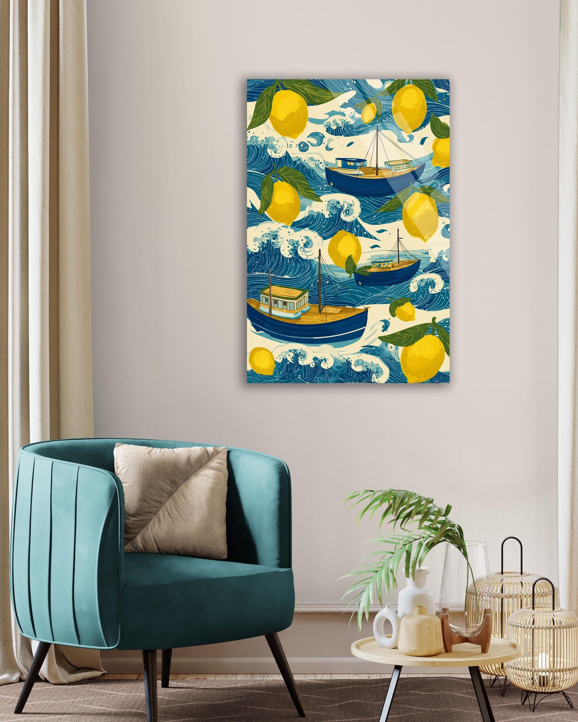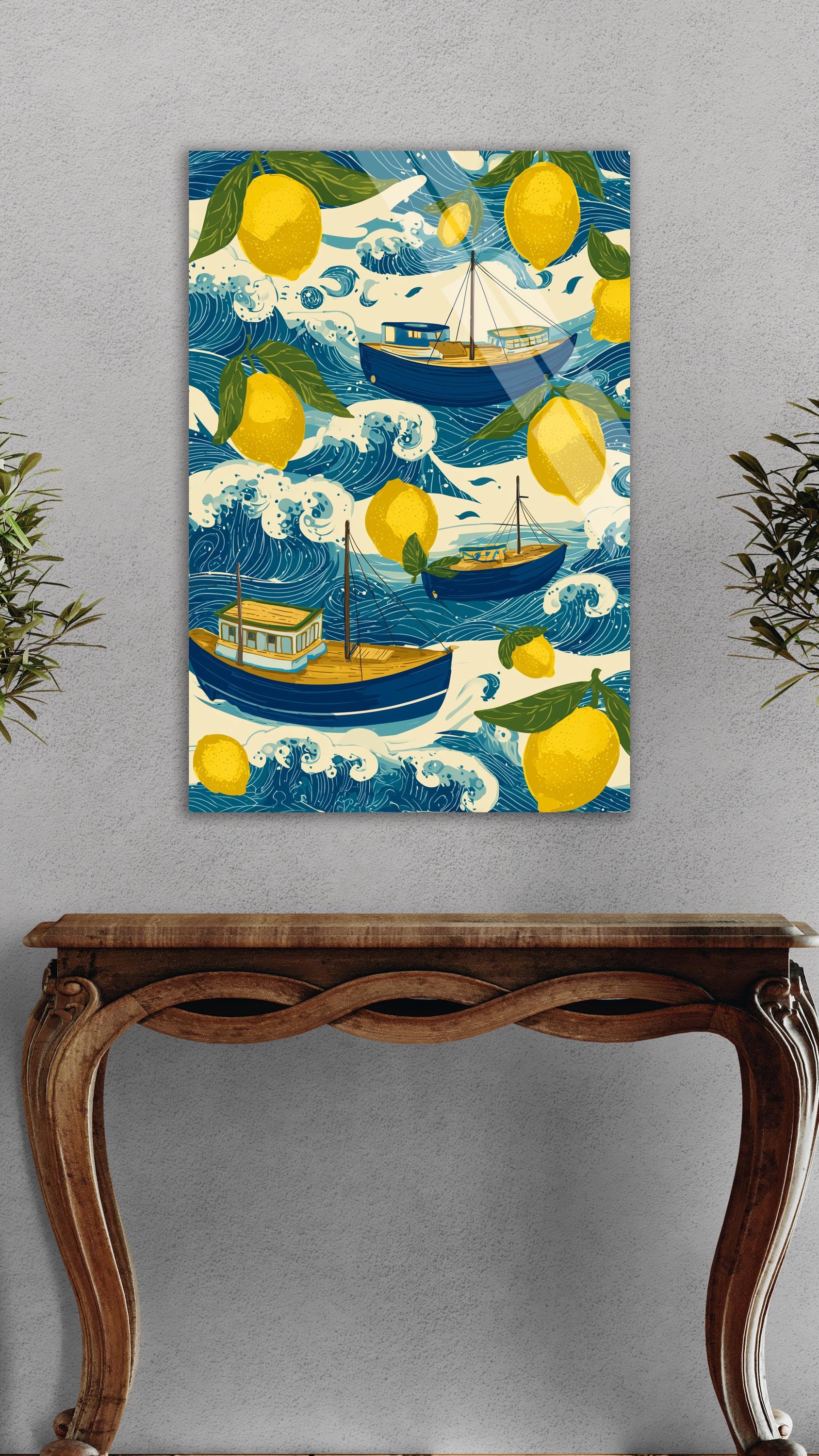 This Lemon Orchard at Sea Tempered Glass Wall Art brings a unique touch of Mediterranean charm to your home. Featuring vibrant blue boat nautical prints and surreal yellow citrus among crashing waves, this large coastal kitchen decor piece is perfect for adding energy to any room. Our tempered glass murals are crafted for durability and high-definition clarity, making the surreal waves and fruit imagery pop with life. Whether you are looking for a housewarming gift or a statement piece for your living area, this citrus-themed glass print offers a refreshing take on traditional maritime themes.