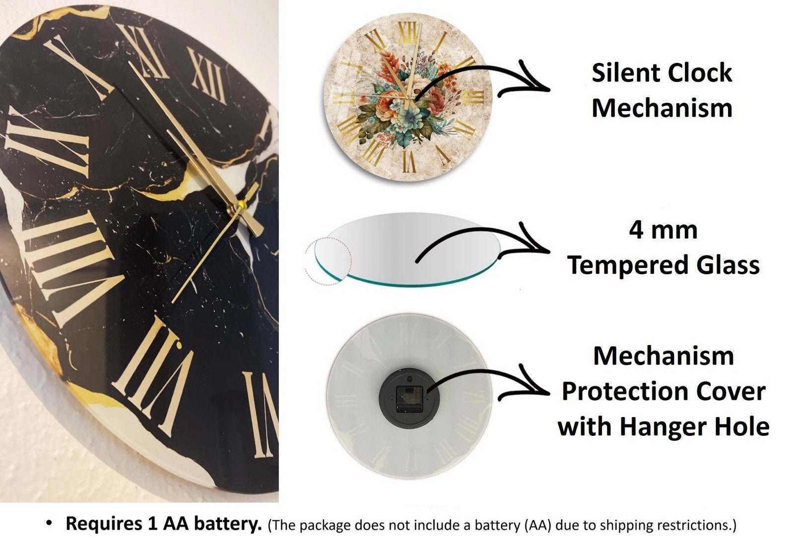 * Premium 4 mm Tempered Glass: Our clock's face is made from high-quality 4 mm thick tempered glass, providing both durability and a sleek, contemporary look. The glass ensures the clock remains scratch-resistant and maintains its crystal-clear appearance over time.