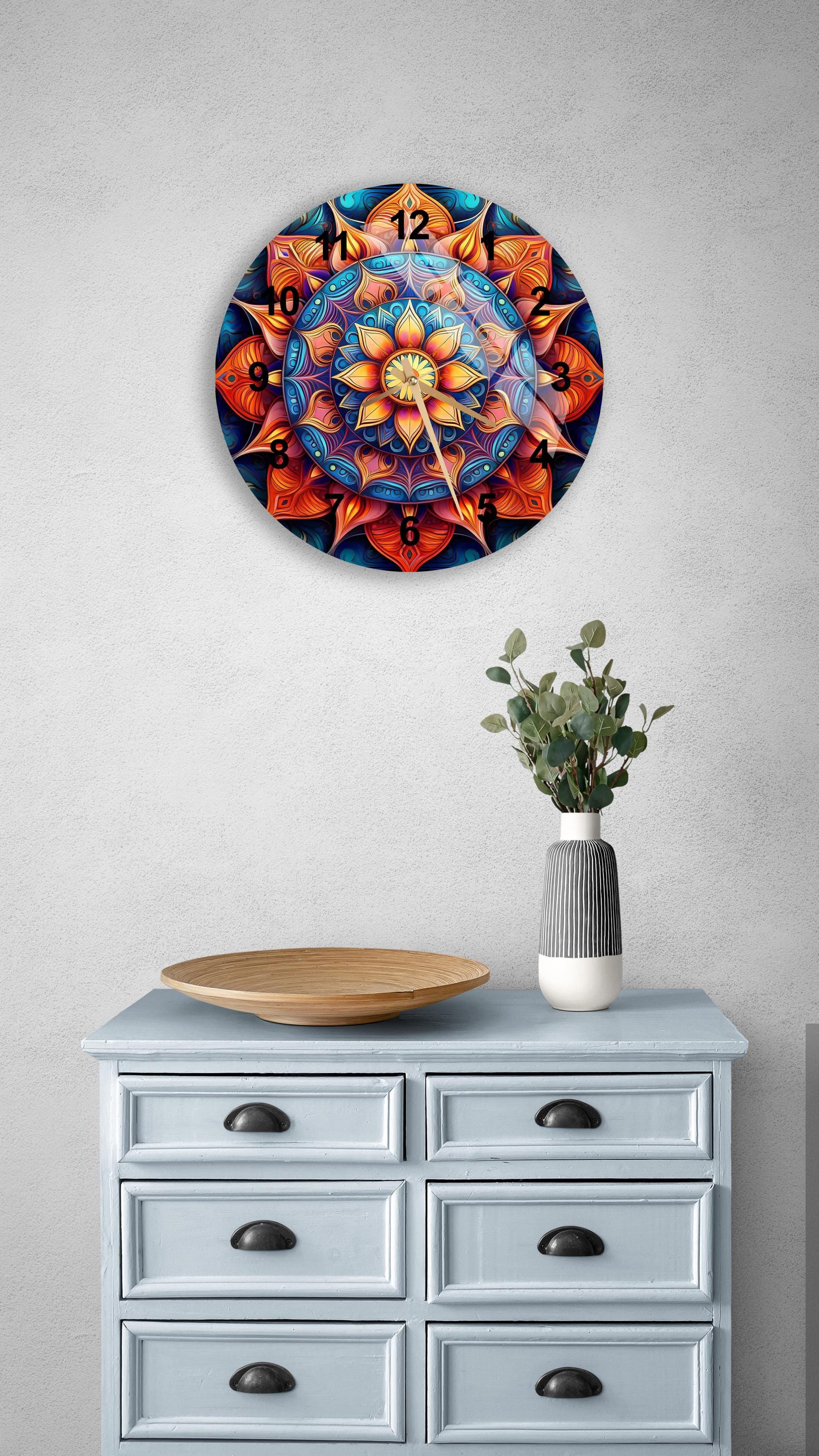 We offer modern tempered glass wall clock art with several themes such as nature, floral and abstract. All of our glass wall clocks are suitable for living rooms, bedrooms, kitchens also for offices and other commercial locations. All of our arts are framed, and ready to hang with metal hangers.